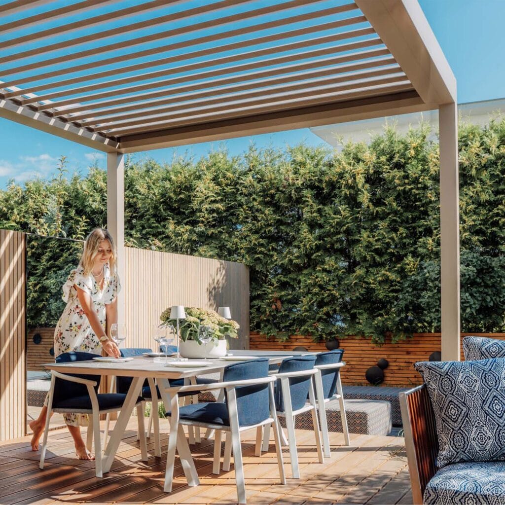 The Technic Pergola offers a perfect solution with featuring a retractable roof system that provides excellent sun and rain protection. The sturdy aluminium structure ensures durability, while the motorized operation allows easy adjustment to control the amount of shade, keeping your patio cool and comfortable.