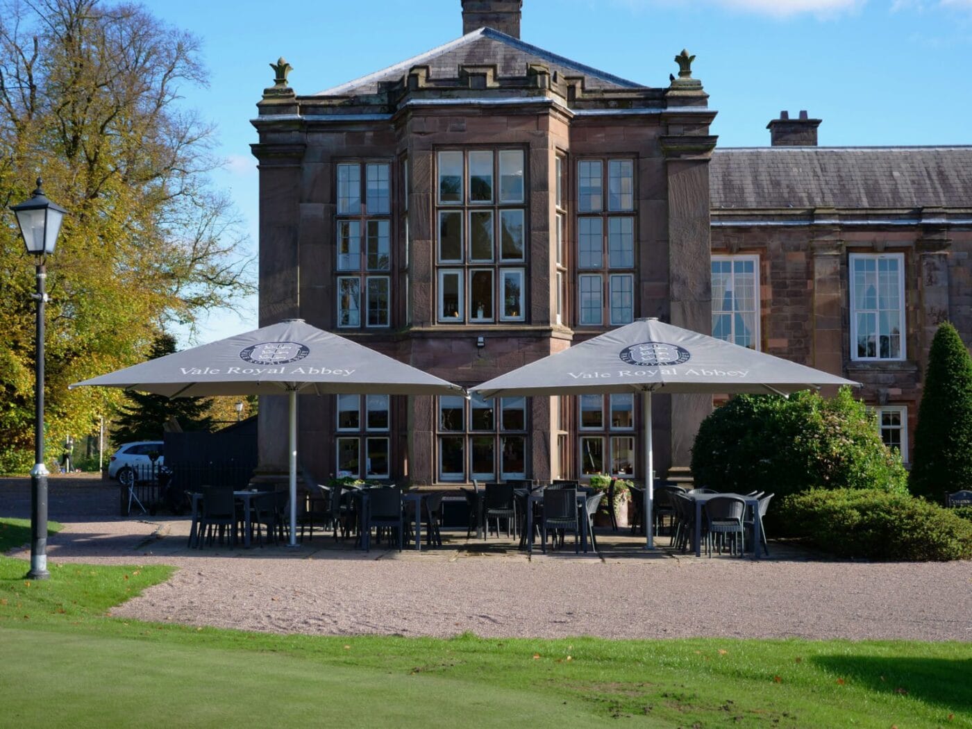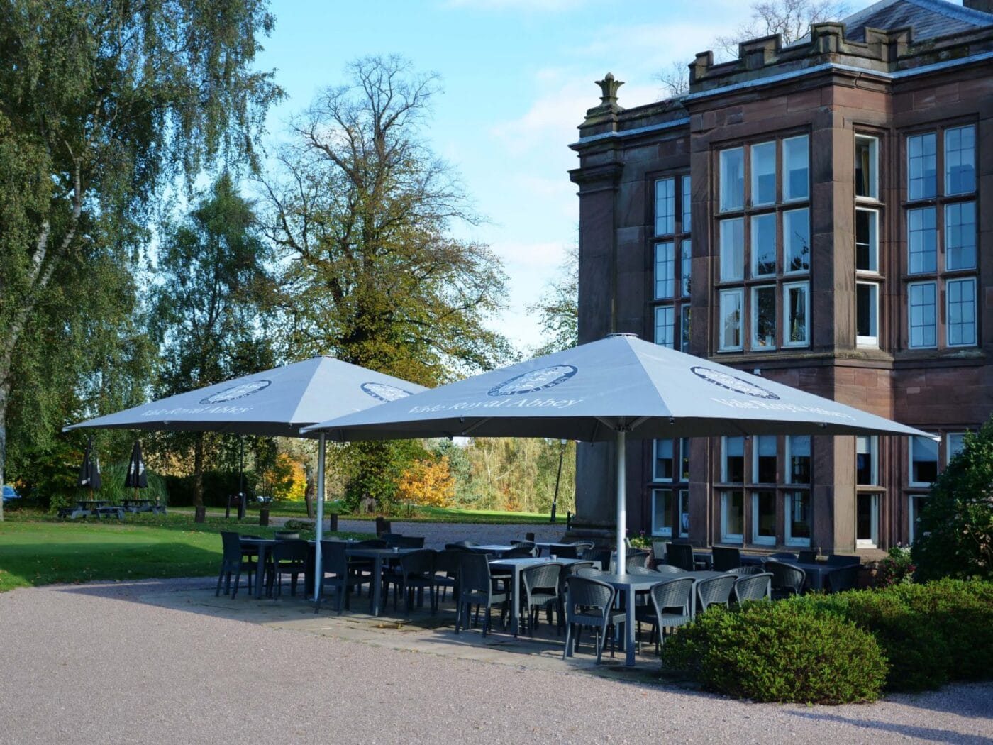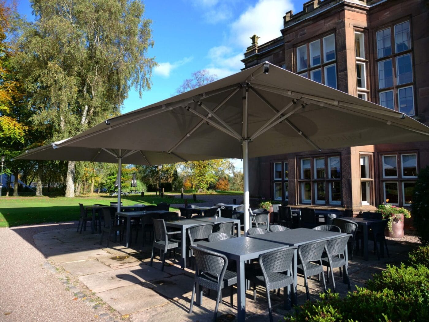 Vale Royal Abbey required cover for their outdoor seating area that would compliment such a grand location. Our 5m Nova parasols were the perfect solution, fitted with concrete base plates, providing year round coverage for guests to enjoy the countryside views.